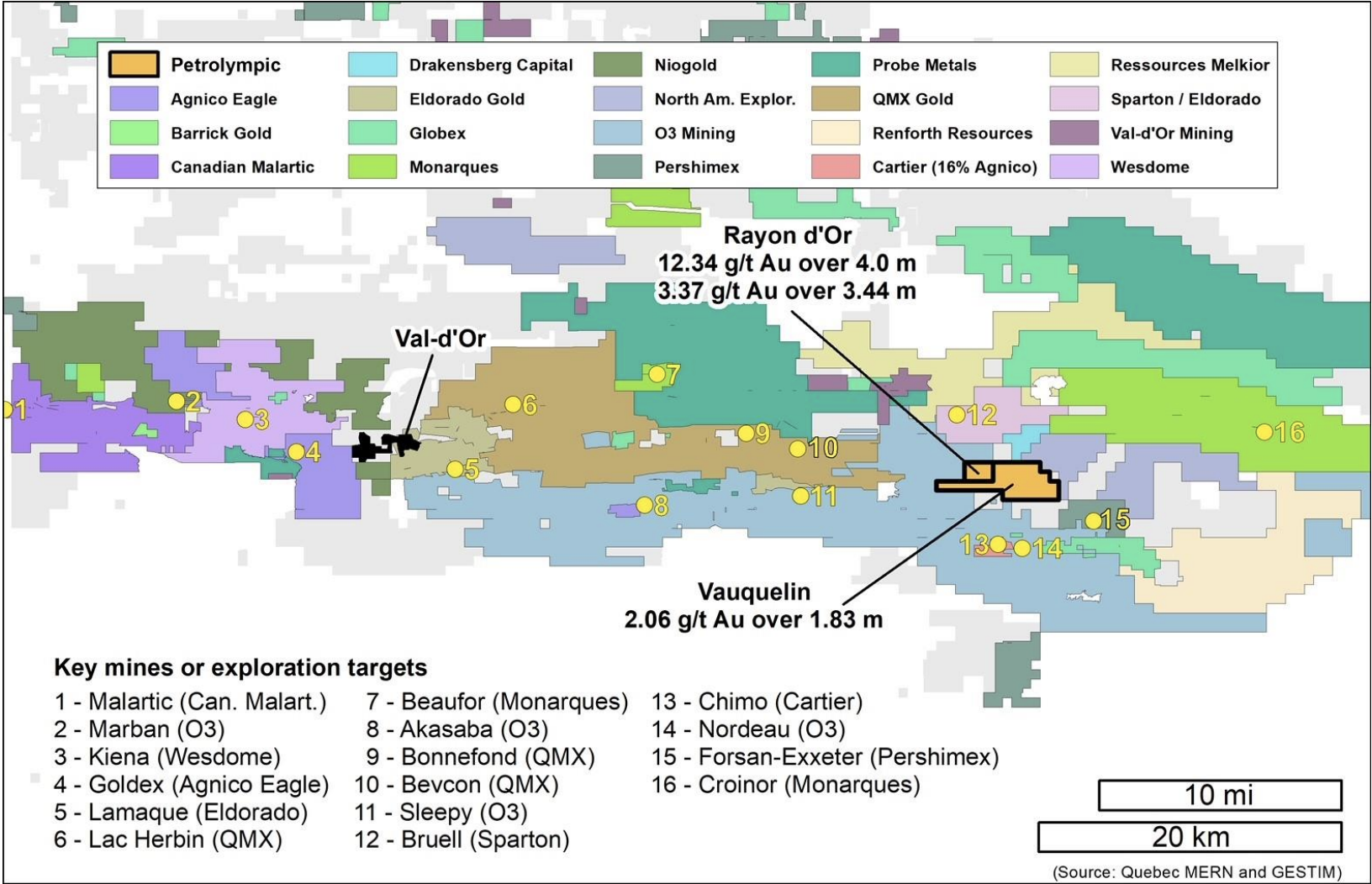 TORONTO, November 11, 2021 – Petrolympic Ltd. (the " Company ", TSXV: PCQ - OTC:PCQRF) is pleased to provide an update on its exploration projects and the potential of the Rayon d’Or and Vauquelin gold properties. Petrolympic is currently developing an exploration program to delineate the extensions of auriferous zones included in the Rayon d’Or and Vauquelin deformation corridor. In particular, the Company is undertaking an airborne magnetic survey followed by a ground Induced Polarization (IP) survey that will help to locate mineralized zones. Detailed mapping of the targeted areas and stripping as needed will follow these surveys, along with a subsequent drilling campaign. On the Rayon d'Or Property specifically, a reinterpretation of the existing data with construction of a 3D model is also planned, to improve the understanding of the mineralized zones of this deformation corridor and develop an effective drilling program, to test the lateral and vertical extensions of known gold-bearing zones. With the recent acquisitions of the Rayon d’Or Property and the adjacent Vauquelin gold property, Petrolympic now owns the rights to an important NW-SE trending structural corridor hosting the Rayon d’Or mineralized zone and its lateral extensions. This zone is part of the regional deformation corridor of the Cadillac Fault, which already includes many active and old mines as well as numerous mineralized zones at different stages of exploration and development. The combined Rayon d’Or and Vauquelin gold properties consist in a total of 37 contiguous map-designated claims (cells) to a grand total of 5,263 Acres of gold potential geology in the center of Vauquelin township (NTS 32C03), approximately 40 km east of the town of Val d’Or, a major gold mining centre in Northwestern Quebec.