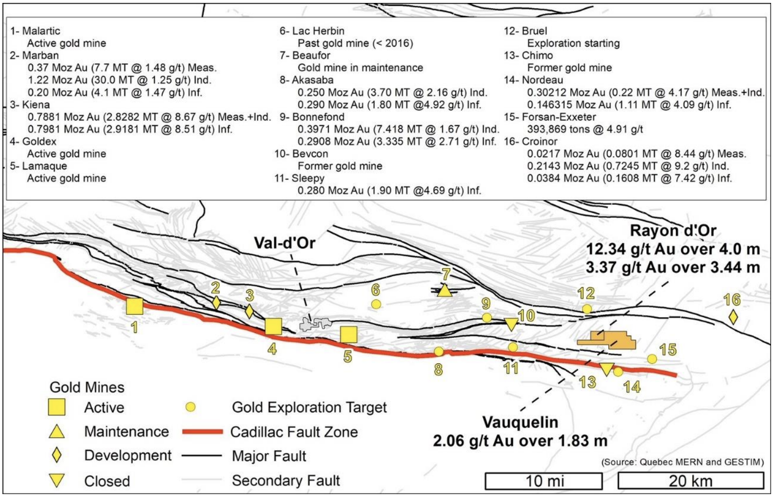 The adjacent Vauquelin Property, in comparison, has been the focus of limited work despite a promising potential. Indeed, Vauquelin is a structural continuity of Rayon d’Or and one of the gold-bearing zones of the Rayon d'Or deformation corridor is located within the Vauquelin Property, as revealed by diamond drill hole # 82-6 which returned a gold intersection of 2.06 g/t Au over 1.83m. A series of electromagnetic anomalies scattered throughout the central part of the Property also indicate the possible presence of prospective mineralized zones. Furthermore, approximately 5 km to the south-east of Vauquelin Property, the Forsan-Exxeter gold deposit is also associated with a NW-SE trending mineralized zone which is located in the lateral extension of the same deformation corridor. This gold deposit contains resources in the amount of 393,869 t at 4.91 g/t Au (Louis Perron, 1988, GM-47652).
