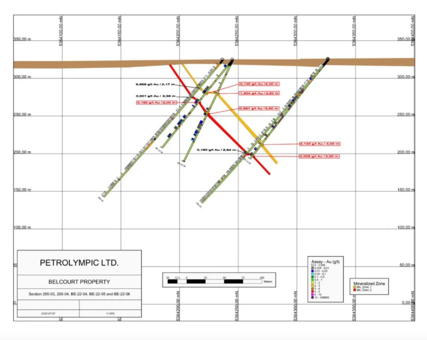 BE-22-04: 2.2 g/t Au over 1.3 m and 3.13 g/t Au over 3 m (including 7.29 g/t Au over 1 m)