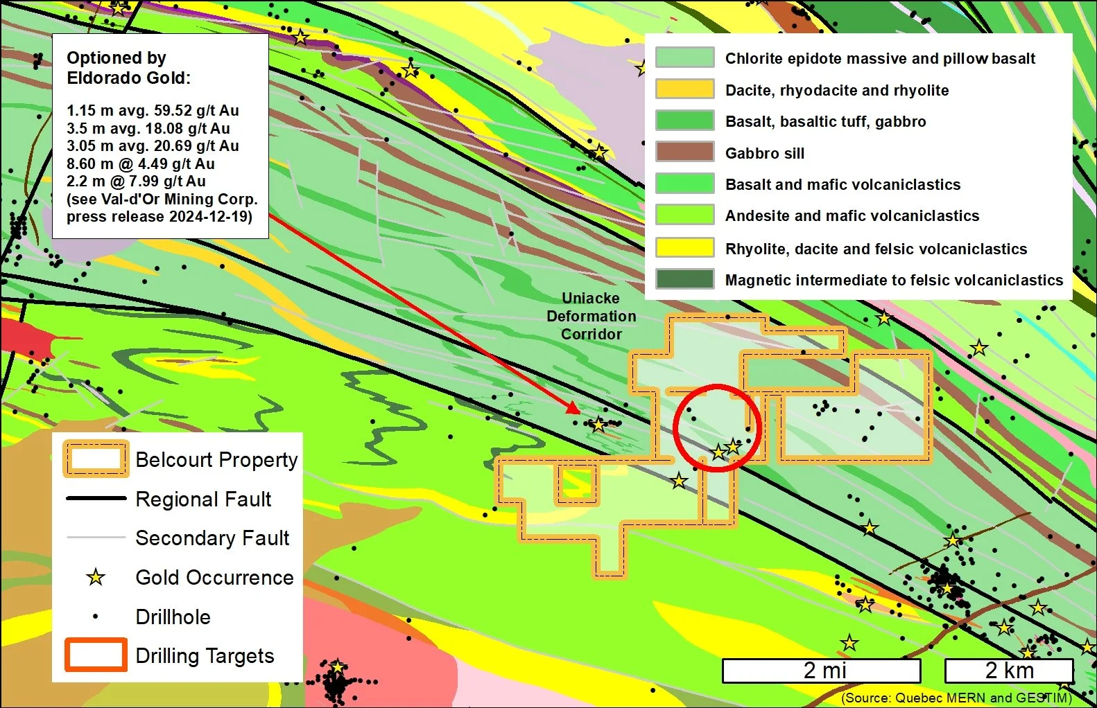 The Property is located in the midst of several other large mineral properties such as Monarch Mining, Eldorado Gold, Pershimex Resources, etc. It lies within the Amos-Barraute Volcanic Rock Belt, in the South-central part of the Abitibi Greenstone Belt. Several porphyritic sills are of economic importance in the region, such as the Pershing Manitou, Rolartic and Bigtown porphyries and sills that host appreciable amounts of gold. Several faults and shear zones have also been reported and interpreted in that general area. Especially, the Belcourt Property is underlain by the important Northwest-Southeast Uniacke Deformation Corridor, which hosts several mineralized zones such as the Héva-Cadillac, Glasnost, Jolin, Thibodeau Zone (Pershing-Manitou) and Eastville showings.