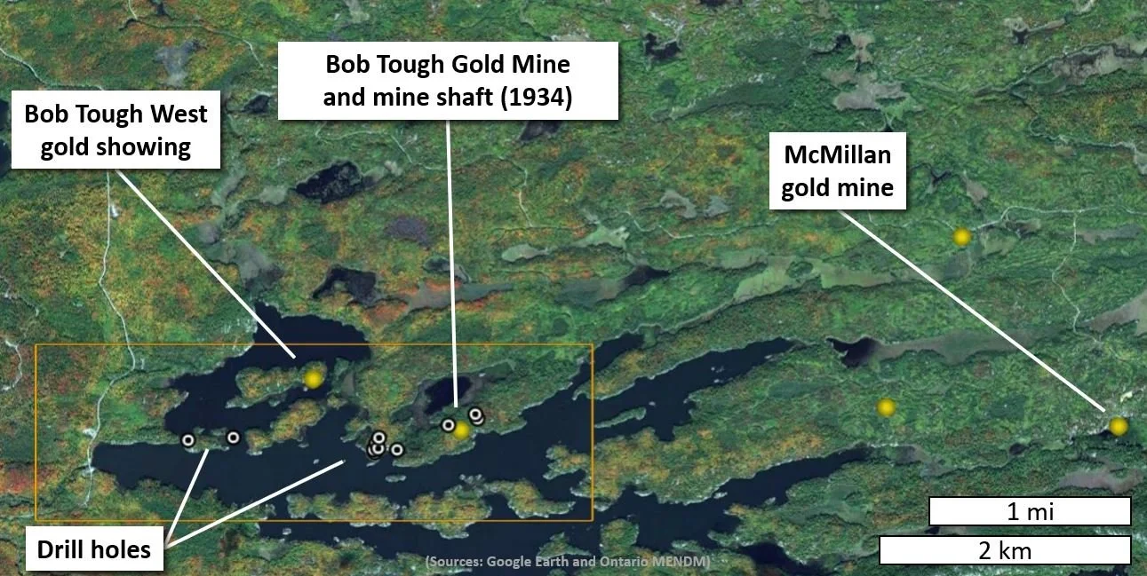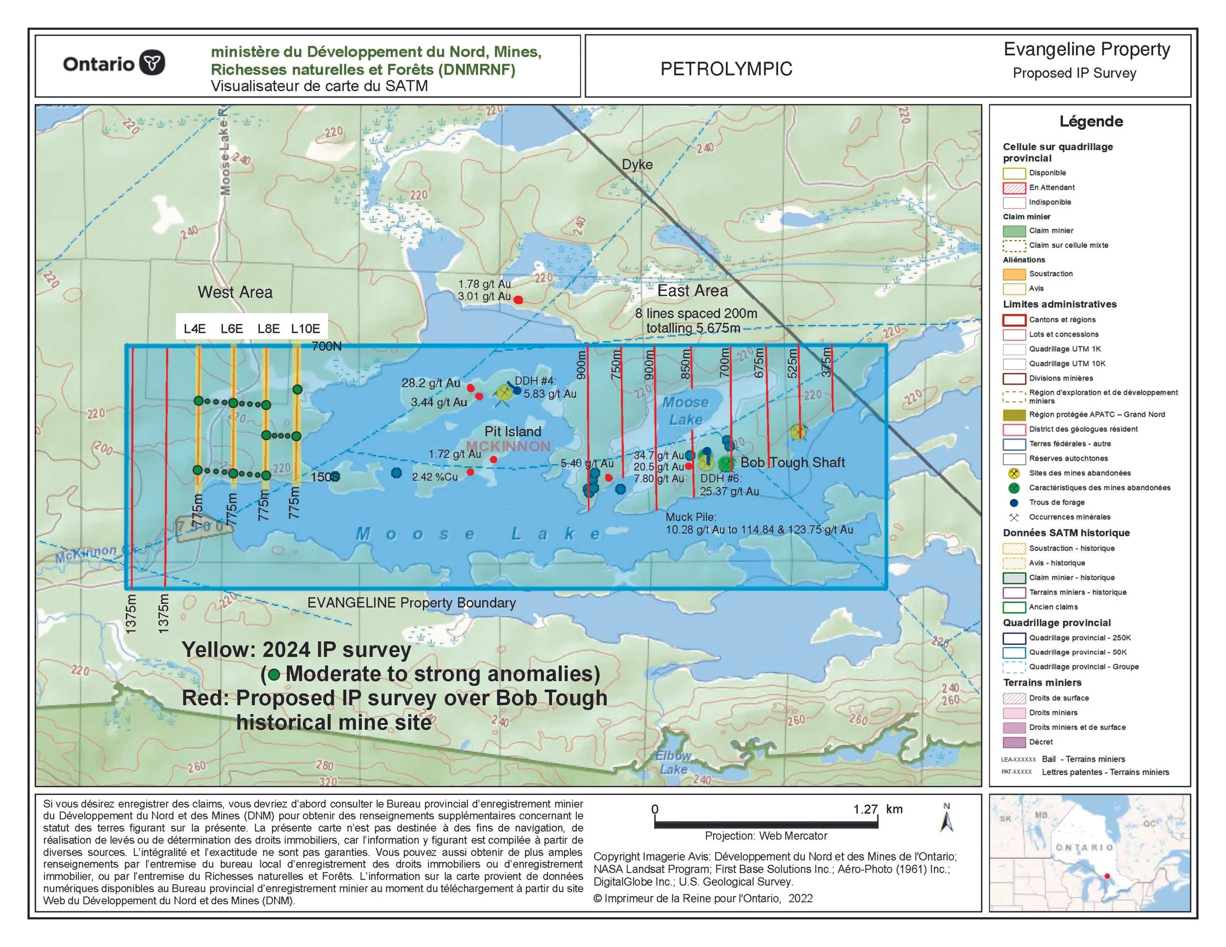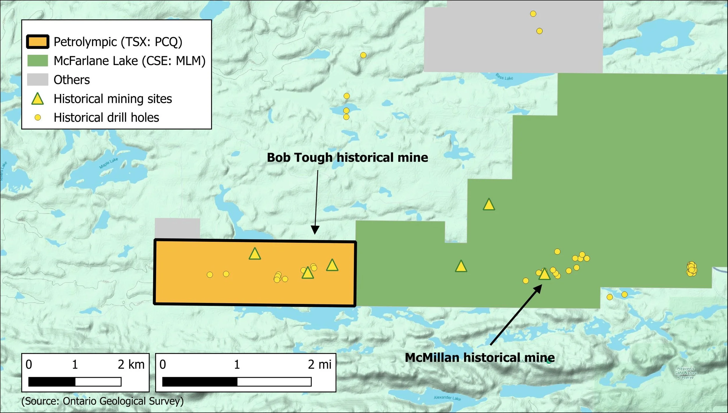 Petrolympic undertook an IP survey in 2024 over a possible extension of the Bob Though West historical site (yellow highlight on map). The survey was successful in detecting a number of chargeable zones that are likely responding to areas containing sulphides or disseminated sulphides. Further work to test these anomalies through diamond drilling is in preparation, along with preparation of an IP survey over the historical Bob Tough mine (East Area on map)." And then this paragraph: "In the vicinity of the historical McMillan gold mine, McFarlane Lake Mining Ltd recently reported mineralized zones returning 13.3 g/t Au over 2.60m, 32.9 g/t Au over 0.7m, 5.1 g/t Au over 4.25 m and 5.5 g/t Au over 7.5m., thus comforting Petrolympic in its strategy to explore around the historical Bob Tough mine site.